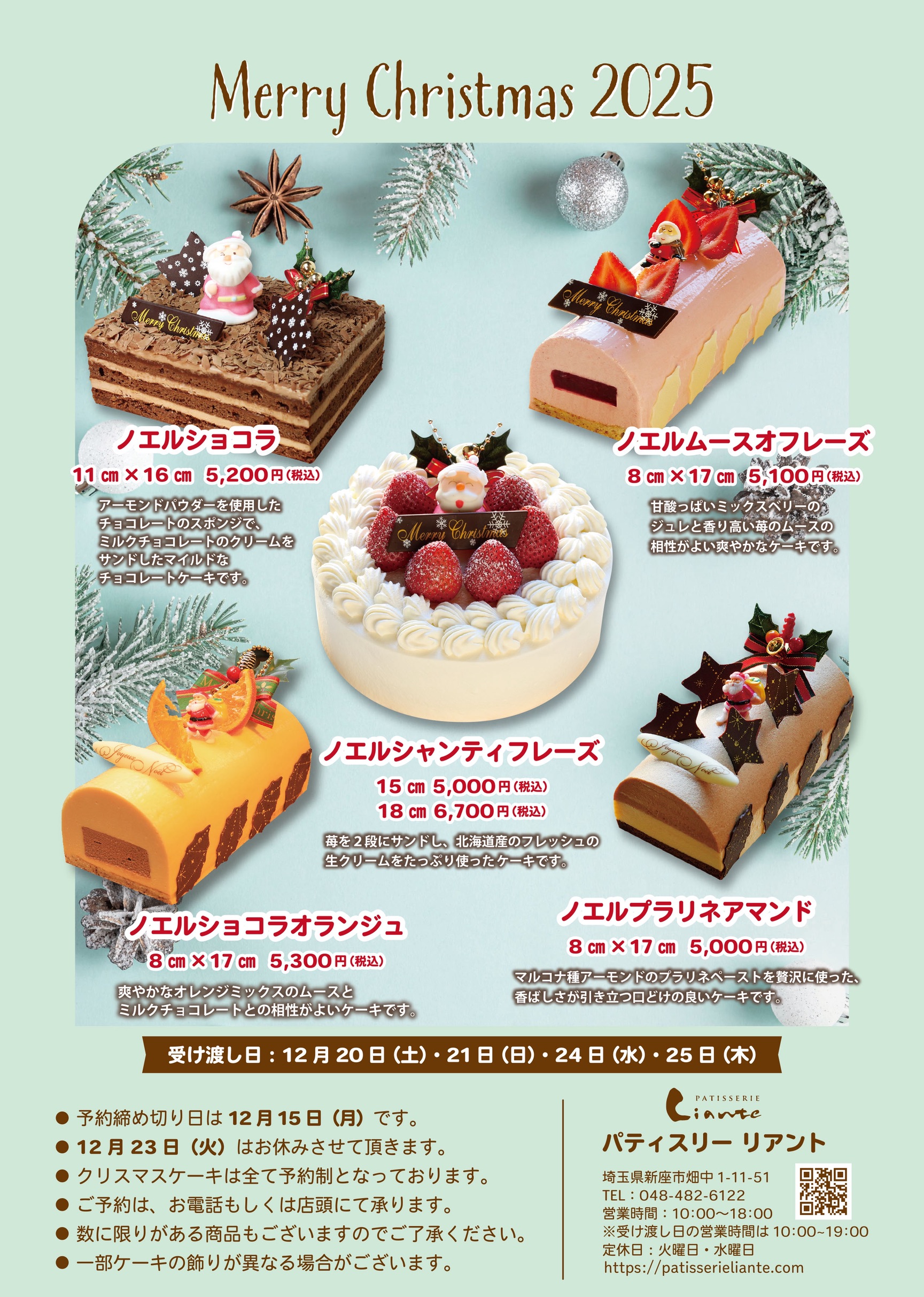 ご予約は、ご来店もしくはお電話にて12月15日(月)まで承ります。 今年のケーキのお渡し日は、12月20日(土)、21日(日)、24日(水)、25日(木)の4日間とさせていただきます。